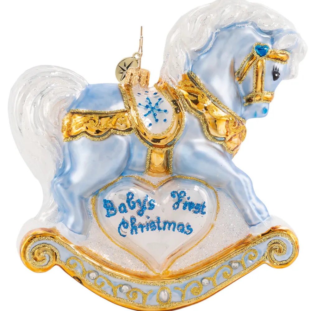 Baby’s First Christmas Foal, It Is A Precious Gift, A Bundle Of Joy — A Darling Bouncing Baby Boy! Commemorate Your New Arrival With This Keepsake Rocking Horse In Baby Blue. 1020687, Christopher Radko