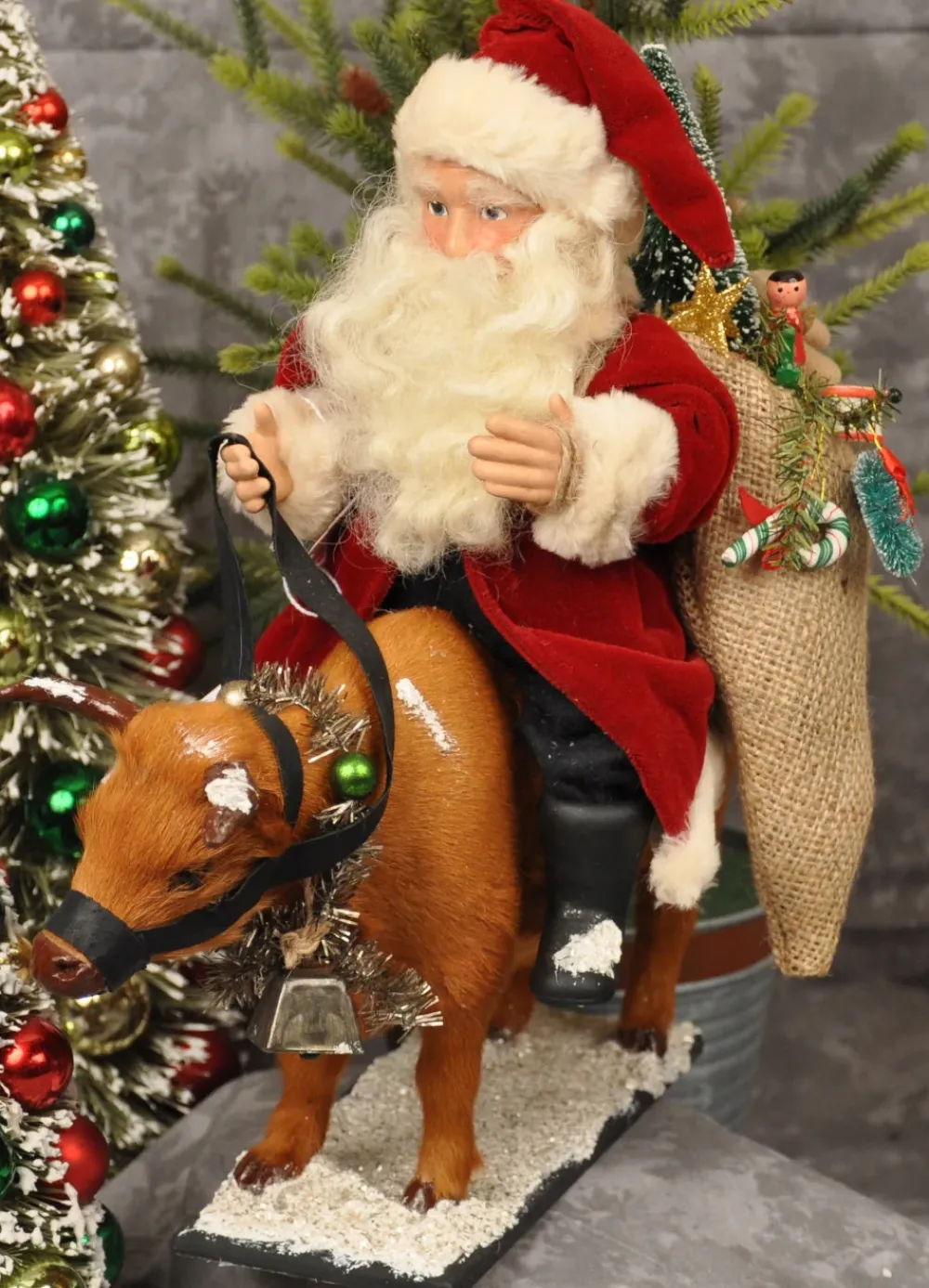 St Nick On Cow, St Nicholas Travels By “Ole Betsy” For Heartland Deliveries, Ole Betsy Os Long Hair Felted Santa Trimmed In Recycled Real Fur