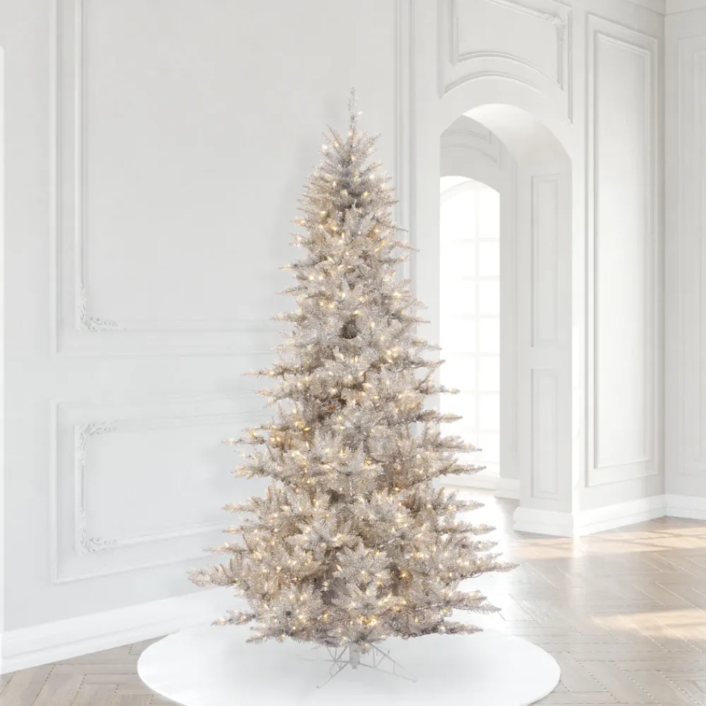 Vickerman 7.5′ Silver Artificial Christmas Tree Featuring 1634 Pvc Tips And 750 Warm White Dura-Lit Led Italian Style Lights On Grey Wire. An Elegant Alternative To The Traditional Green Christmas Tree, This Brilliant Tree Comes Prelit With Warm White Dura-Lit Led Mini Lights, Has Rich Colored Pvc Tips On Metal Hinged Branches, An On/Off Step Switch, And A Metal Tree Stand Is Included.
